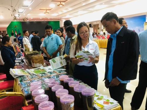 Noualyny (right from poster) promoting SRP certification for a stronger and more climate-resilient agricultural sector in Cambodia